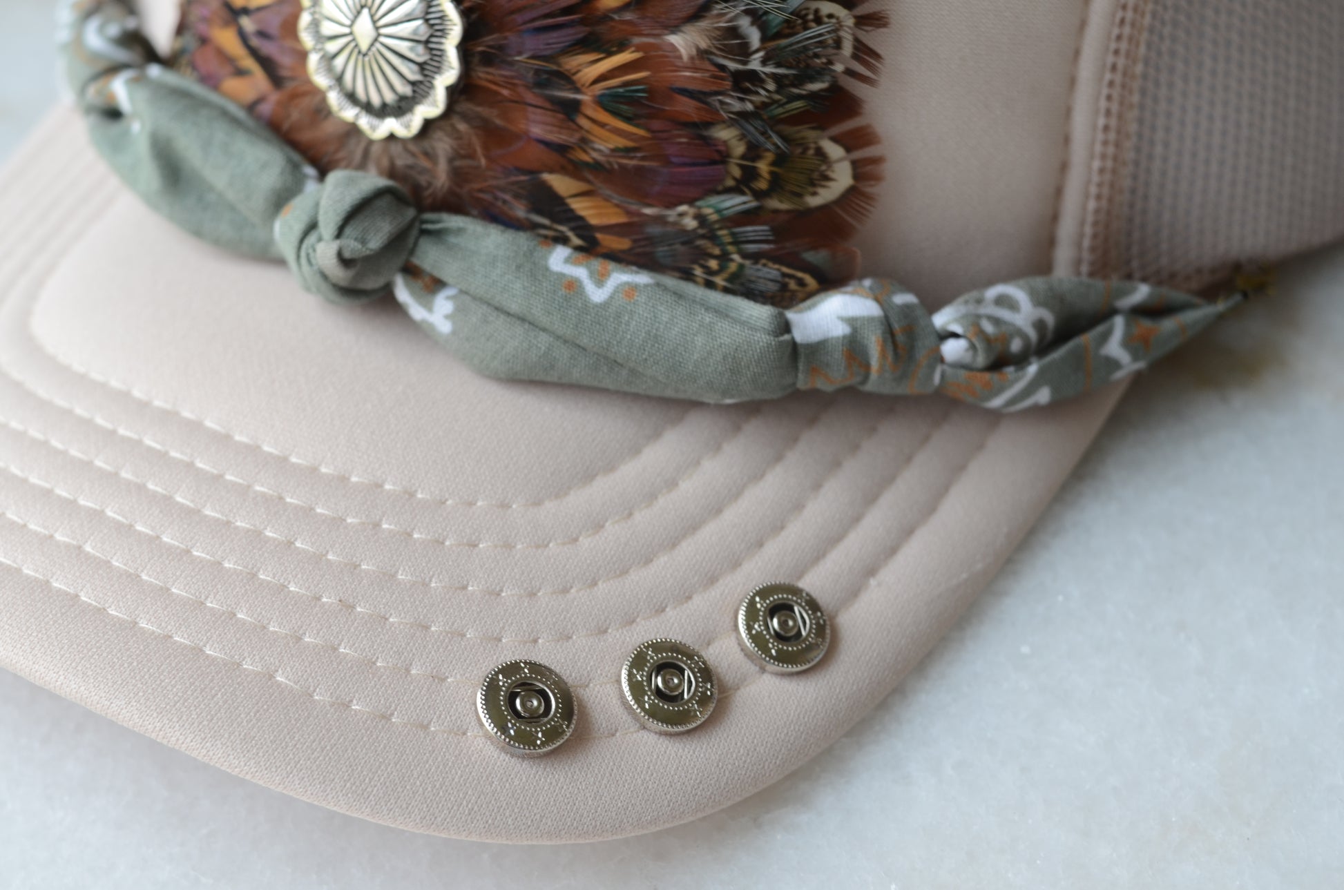 Tan Otto trucker hat + feather crest + army green bandana hat band + silver conch + silver rivets