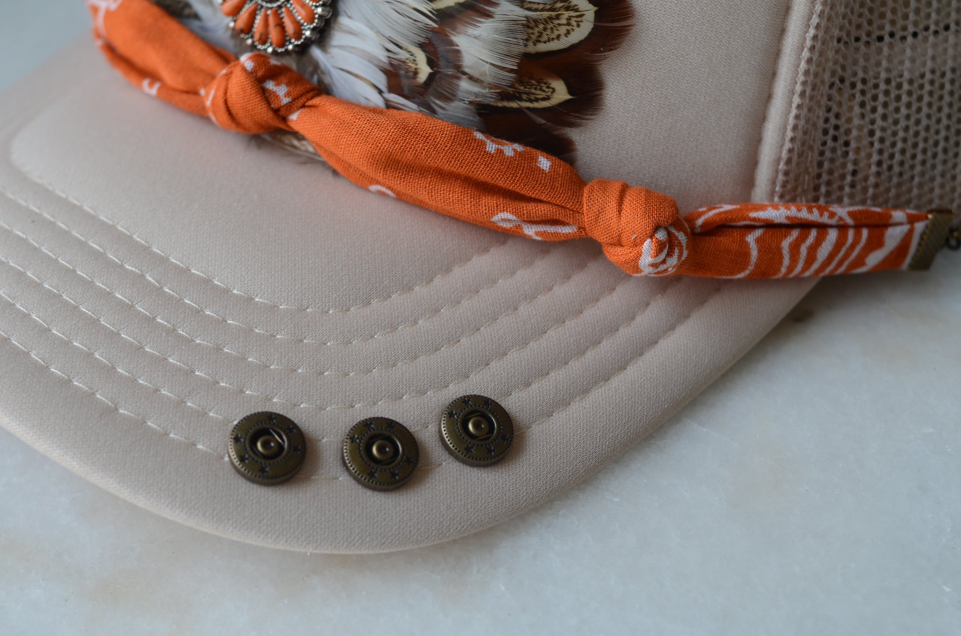 Tan Otto trucker + feather crest + orange bandana hat band + orange and turquoise conch + antique brass robots